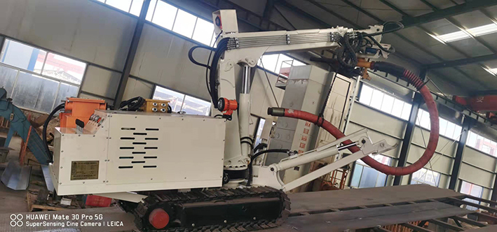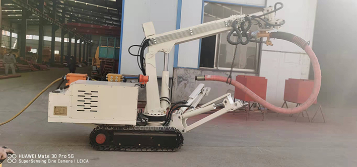 CPF-6OLY型礦用混凝土輔助噴射車(chē)(以下簡(jiǎn)稱(chēng)噴漿機(jī)械手)主要用于煤礦井下煤巷、半煤巷、全巖石掘進(jìn)巷道與混凝土噴射機(jī)配套使用,代替人工噴漿作業(yè),滿(mǎn)足噴漿工藝要求,整機(jī)小巧、靈活、耐用、適應(yīng)能力強(qiáng),可用于大型噴漿機(jī)組無(wú)法進(jìn)入的巷道,實(shí)現(xiàn)噴漿無(wú)線(xiàn)操作、機(jī)械化作業(yè),減輕人工噴射勞動(dòng)強(qiáng)度大的問(wèn)題。整機(jī)完全采用無(wú)線(xiàn)遙控操作、液壓控制,工作性能安全可靠。下車(chē)液壓系統(tǒng)負(fù)責(zé)行走、上車(chē)液壓系統(tǒng)負(fù)責(zé)噴射,上下車(chē)動(dòng)作手動(dòng)切換,防止誤操作。整機(jī)具有結(jié)構(gòu)穩(wěn)定可靠,動(dòng)作平穩(wěn),噴射范圍大,自由度多,遙控操作靈活,噴射平整度好,回彈少,噴射效率高、施工質(zhì)量好,可實(shí)現(xiàn)遠(yuǎn)程控制,操作人員可位于在可視情況好、粉塵濃度少,較為安全的位置操作,保證使用人員安全。